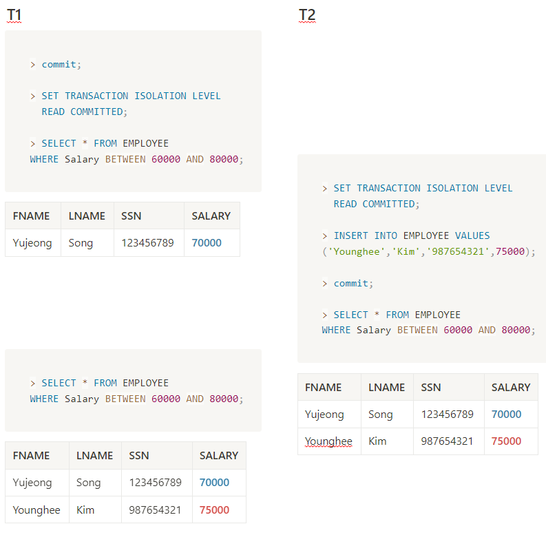 ⚠️ T1에서 2번째 읽을 때 같은 SALARY값을 읽을 수 없다 ⇒ Non-repeatable read