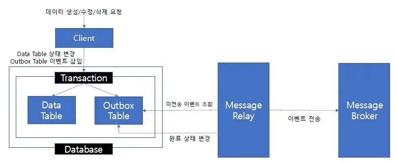 - Message Relay가 Outbox 테이블에서 미전송 이벤트를 조회하여 Message Broker로 전송하고, Outbox 테이블에 전송 완료 처리를 한다.