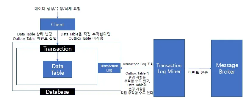 - 데이터베이스의 트랜잭션 로그를 추적 및 분석하고, 아웃박스 테이블의 데이터 변경만을 필터링(Transaction log miner)해 Message Broker에 이벤트를 전달한다.