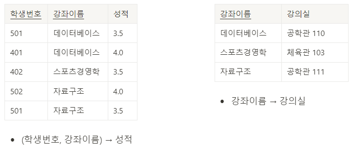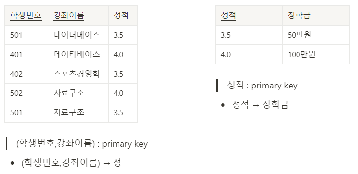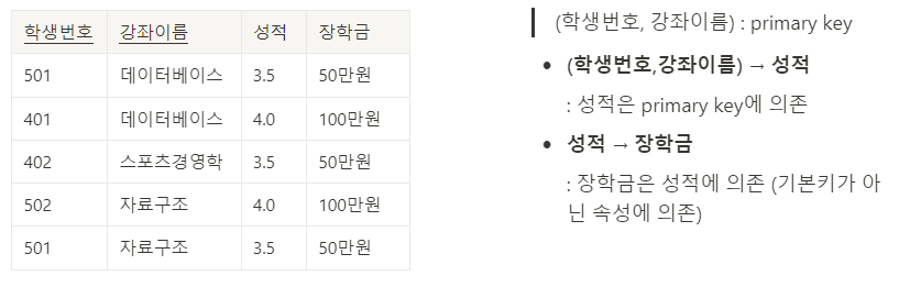 - 기본키가 아닌 속성들은 기본키에 의존해야함