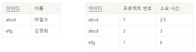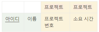 - 아이디, 이름, 프로젝트(프로젝트 번호, 시간)